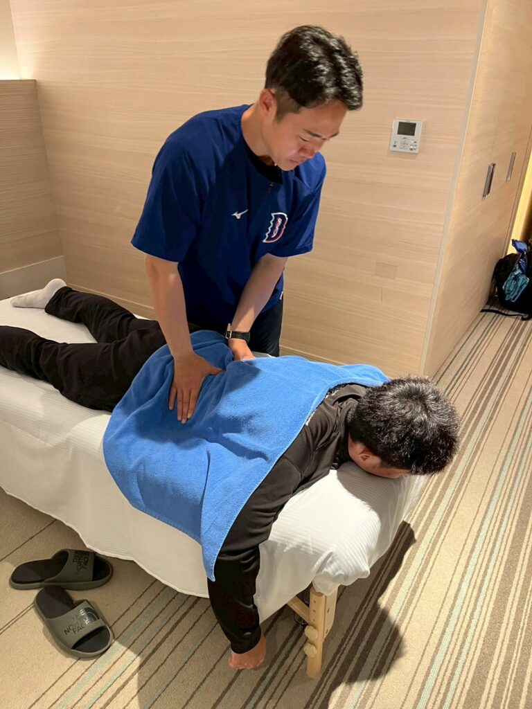 五十嵐トレーナー(鍼灸師)は、普段は治療院でスタッフをまとめながら、自身も一般の患者へ治療を提供している。